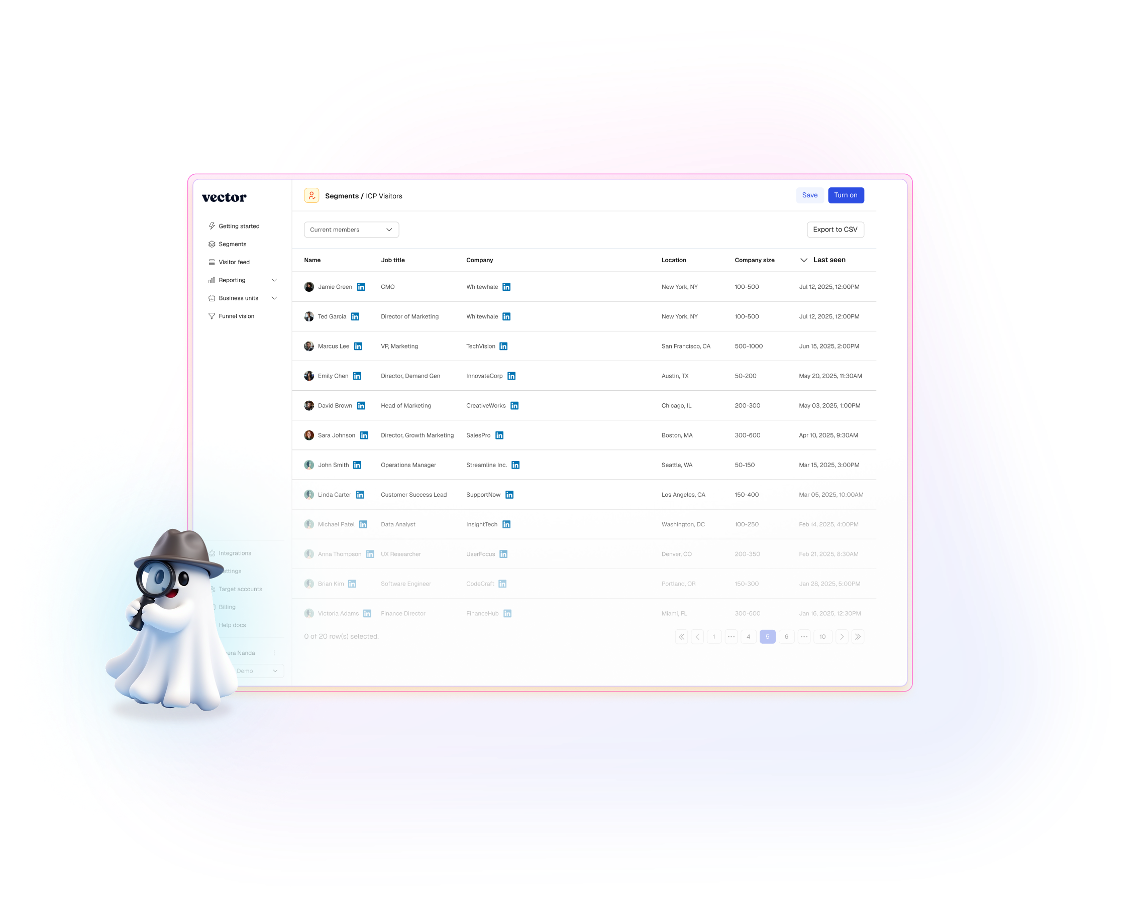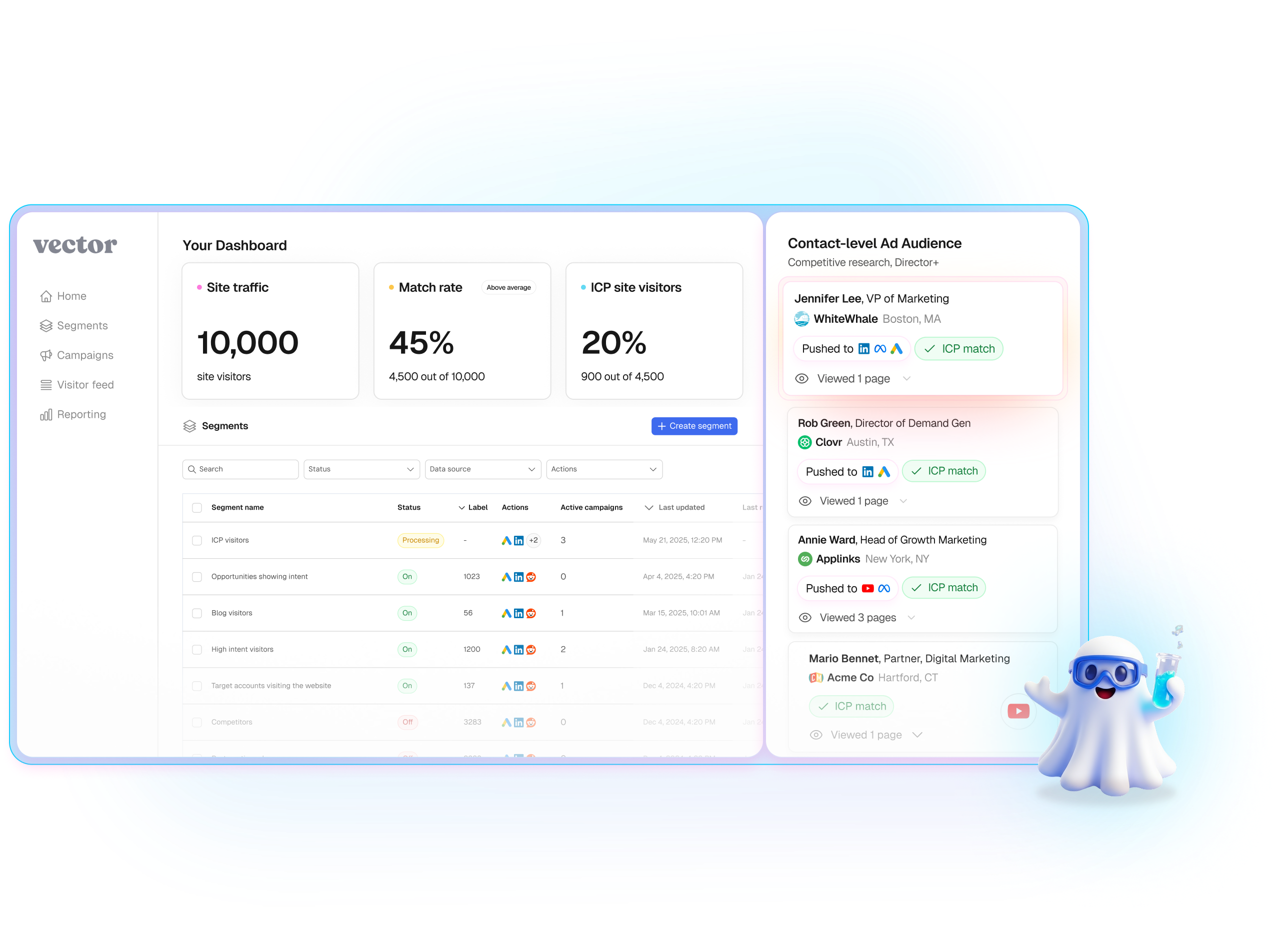 Your accounts are tiered. Your plays are mapped. But how are you reaching your decision makers? Vector gives you contact-level signal and targeting— by name, by behavior, in real time — so you actually reach your target accounts and buyer personas at scale.